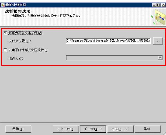 10、彈出【選擇報告選項】對話框,在該對話框里可以選擇如何管理維護計劃報告:可以將報告寫入文件中,或通過電子郵件發(fā)送數(shù)據(jù)庫管理員。設(shè)置完畢后單擊【下一步】按鈕。