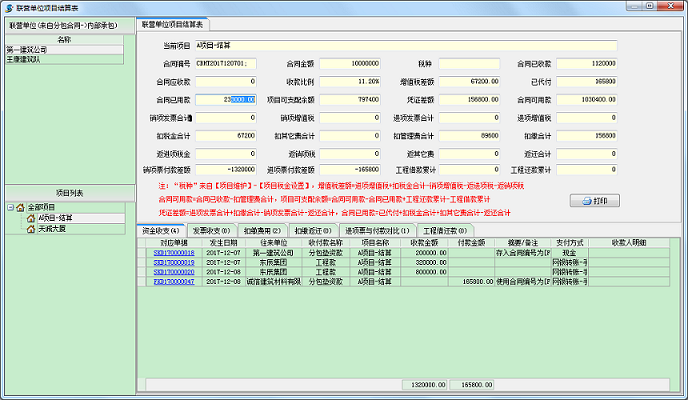 一、 左上角的【聯(lián)營(yíng)單位】列表來自【分包合同】類型為“內(nèi)部承包”的乙方單位。 左下角的【項(xiàng)目列表】來自聯(lián)營(yíng)單位與我單位簽定“內(nèi)部承包”的【分包合同】中的項(xiàng)目名稱。二、 合同編號(hào):對(duì)應(yīng)當(dāng)前項(xiàng)目下的承包合同編號(hào); 合同金額:對(duì)應(yīng)當(dāng)前項(xiàng)目下的承包合同金額; 稅種:對(duì)應(yīng)【項(xiàng)目維護(hù)】->【項(xiàng)目稅金設(shè)置】->【增值稅稅率】 合同已收款:對(duì)應(yīng)當(dāng)前項(xiàng)目下的承包合同收取的工程款數(shù)額; 合同應(yīng)收款:對(duì)應(yīng)當(dāng)前項(xiàng)目下的承包合同應(yīng)收的工程款數(shù)額; 收款比例:合同已收款/合同金額; 增值稅差額:進(jìn)項(xiàng)增值稅+扣稅金合計(jì)-銷項(xiàng)增值稅-返進(jìn)項(xiàng)稅-返銷項(xiàng)稅; 已代付:代支付給材料供應(yīng)商、分包商或其他往來單位的款項(xiàng)金額; 合同已用款:已代付金額+扣稅金合計(jì)+扣其他費(fèi)合計(jì)-返還合計(jì); 合同可用款:合同已收款-扣管理費(fèi)合計(jì); 項(xiàng)目可支配余額:合同可用款-合同已用款+工程還款累計(jì)-工程借款累計(jì); 憑證差額:進(jìn)項(xiàng)發(fā)票合計(jì)+扣繳合計(jì)-銷項(xiàng)發(fā)票合計(jì)-返還合計(jì); 銷項(xiàng)發(fā)票合計(jì):對(duì)應(yīng)當(dāng)前項(xiàng)目下開出發(fā)票的合計(jì)金額; 銷項(xiàng)增值稅:對(duì)應(yīng)當(dāng)前項(xiàng)目下開出發(fā)票的增值稅稅額; 進(jìn)項(xiàng)發(fā)票合計(jì):對(duì)應(yīng)當(dāng)前項(xiàng)目下收入發(fā)票的合計(jì)金額; 進(jìn)項(xiàng)增值稅:對(duì)應(yīng)當(dāng)前項(xiàng)目下收入發(fā)票的增值稅稅額; 扣稅金合計(jì):對(duì)應(yīng)當(dāng)前項(xiàng)目聯(lián)營(yíng)單位的【分包合同】->【扣繳費(fèi)用】下稅金合計(jì); 扣管理費(fèi)合計(jì):對(duì)應(yīng)當(dāng)前項(xiàng)目聯(lián)營(yíng)單位的【分包合同】->【扣繳費(fèi)用】下管理費(fèi)合計(jì); 扣其它費(fèi)合計(jì):對(duì)應(yīng)當(dāng)前項(xiàng)目聯(lián)營(yíng)單位的【分包合同】->【扣繳費(fèi)用】下其它費(fèi)合計(jì); 扣繳合計(jì):扣稅金合計(jì)+扣管理費(fèi)合計(jì)+扣其其它合計(jì); 返進(jìn)項(xiàng)稅金:對(duì)應(yīng)當(dāng)前項(xiàng)目聯(lián)營(yíng)單位的【分包合同】->【扣繳返回】下的進(jìn)項(xiàng)稅合計(jì); 返銷項(xiàng)稅金:對(duì)應(yīng)當(dāng)前項(xiàng)目聯(lián)營(yíng)單位的【分包合同】->【扣繳返回】下的銷項(xiàng)稅合計(jì); 返其它費(fèi):對(duì)應(yīng)當(dāng)前項(xiàng)目聯(lián)營(yíng)單位的【分包合同】->【扣繳返回】下的其它費(fèi)合計(jì); 返還合計(jì):返進(jìn)項(xiàng)稅金+返銷項(xiàng)稅金+返其它費(fèi); 銷項(xiàng)票收款差額:當(dāng)前項(xiàng)目累計(jì)開出發(fā)票與收款之差; 進(jìn)項(xiàng)票付款差額:當(dāng)前項(xiàng)目累計(jì)收進(jìn)發(fā)票與付款之差; 工程借款累計(jì):對(duì)應(yīng)當(dāng)前項(xiàng)目下該聯(lián)營(yíng)單位的工程借款; 工程還款累計(jì):對(duì)應(yīng)當(dāng)前項(xiàng)目下該聯(lián)營(yíng)單位的工程還款;