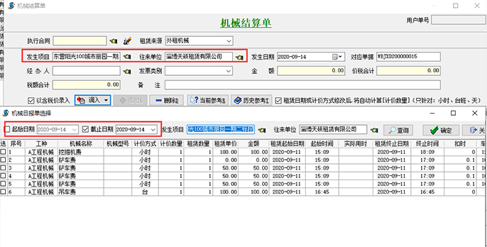 【機(jī)械結(jié)算單】需先設(shè)置發(fā)生的項(xiàng)目和往來(lái)單位,根據(jù)下圖所示:點(diǎn)擊圖中“調(diào)入”按鍵,選擇起始日期和截止日期(截止日期默認(rèn)是錄單日期),選中下方涉及的租賃明細(xì)生成一張完整的【機(jī)械結(jié)算單】。