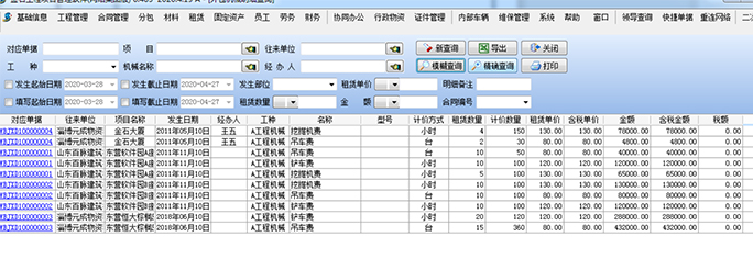 同時,已經(jīng)生成的各種信息,可以在【外包機械明細(xì)查詢】模塊查詢所有的機械往來明細(xì)。