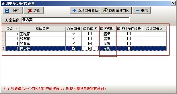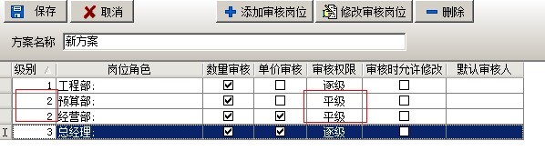 在多級(jí)審核中,可以設(shè)置多套審核方案,每套方案可設(shè)置多個(gè)崗位,可設(shè)置方案的授權(quán)發(fā)起用戶(在業(yè)務(wù)單據(jù)中選擇該審核方案的用戶)。在添加方案時(shí),有三種方式逐級(jí)審核、平級(jí)審核、跨級(jí)審核。逐級(jí)審核是指各個(gè)崗位按先后順序依次審核該業(yè)務(wù)單據(jù),例如審核順序?yàn)椋こ滩俊㈩A(yù)算部、經(jīng)營(yíng)部、總經(jīng)理如下圖:
