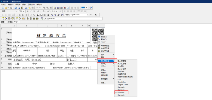 2、設(shè)置二維碼顯示位置及數(shù)據(jù)源。根據(jù)報(bào)表選定二維碼顯示位置,右鍵點(diǎn)擊單元格,選擇單元格類(lèi)型為Barcode,如圖: