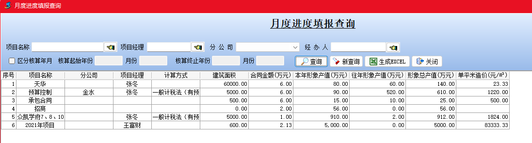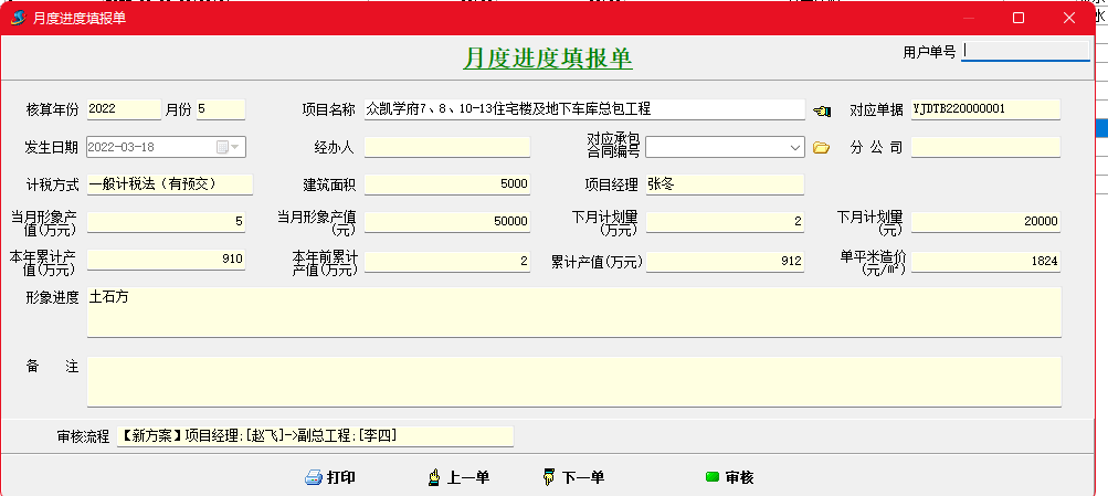 月度進(jìn)度填報(bào)單可以實(shí)現(xiàn)按月上報(bào)形象產(chǎn)值進(jìn)度并自動(dòng)統(tǒng)計(jì)當(dāng)年度產(chǎn)值,總產(chǎn)值以及單平米造價(jià)??梢钥梢愿鶕?jù)上報(bào)的產(chǎn)值計(jì)算待收款以及利潤(rùn)。