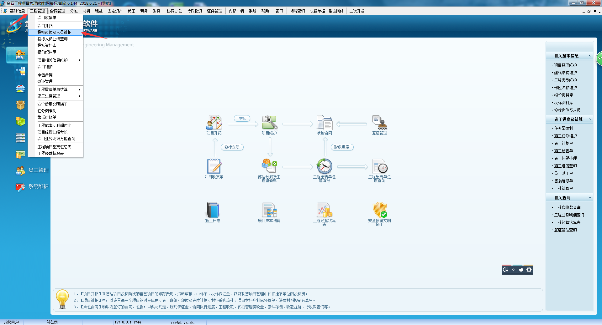 首先在軟件菜單欄點擊【工程管理】,打開【投標崗位及人員維護】,如下圖: