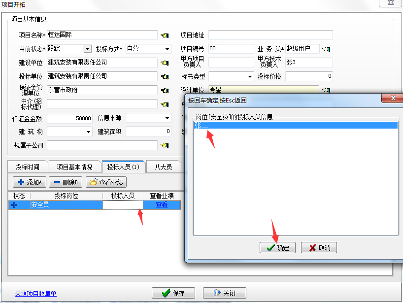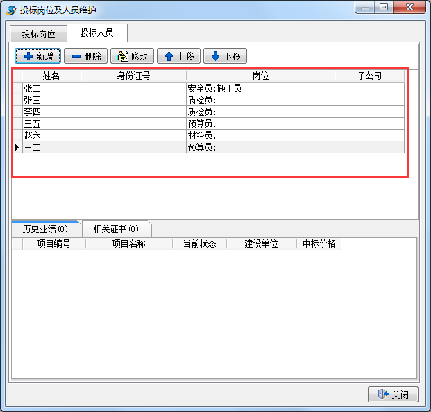 錄入好姓名后,選擇相對應的崗位(選擇崗位時,可以一人設多崗),依次添加好投標人員后,關閉該窗口,如下圖: