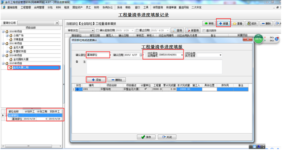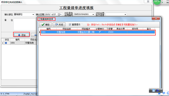 然后點(diǎn)“添加”按鈕,在彈出的“工程量清單選”窗口中選擇需要填報(bào)的清單內(nèi)容,然后在本次完成量處輸入已完成的工作量,如圖: