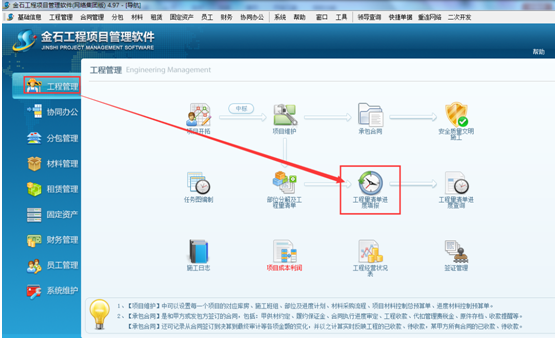 “工程量清單進(jìn)度查詢”在工程進(jìn)行過程中,可以隨時(shí)查詢現(xiàn)場填報(bào)已完成工程量清單,從而方便向甲方報(bào)施工進(jìn)度。按進(jìn)度進(jìn)行結(jié)算。1.進(jìn)入系統(tǒng)的“工程管理”模塊,點(diǎn)擊“工程量清單進(jìn)度查詢”,如圖: