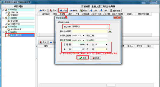 如下圖所示,在彈出的“項(xiàng)目部位分解及工程量清單設(shè)置”窗口中點(diǎn)“添加”按鈕,然后依次填寫項(xiàng)目部位名稱、工程量、單位等相關(guān)信息,