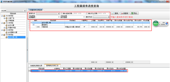 2.選中相應(yīng)的項(xiàng)目,點(diǎn)查詢,查看工程量清單進(jìn)度。也可輸入查詢條件進(jìn)行查詢,如圖: