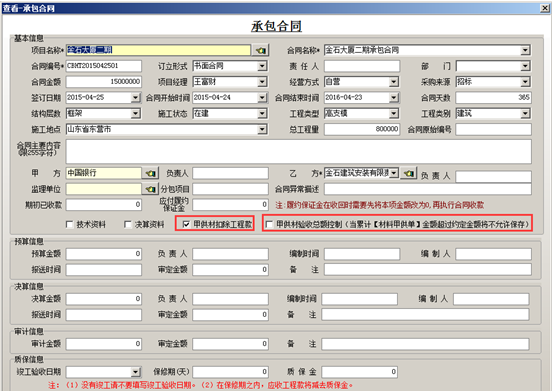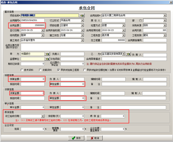 在編輯合同內(nèi)容時(shí)一定要注意填寫(xiě)“合同金額”、“預(yù)算信息”里面的“預(yù)算金額”“審定金額”,“決算信息”里面的“結(jié)算金額”“審定金額”,如果有質(zhì)量保證金,則輸入“竣工日期”“保修期”以及“質(zhì)保金”金額。