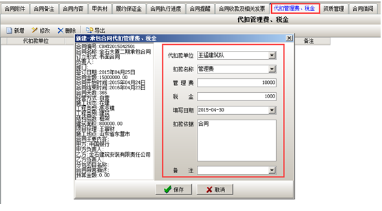 代扣管理費(fèi)稅金扣除的是我方借別的公司的資質(zhì)扣除的費(fèi)用,根據(jù)發(fā)票金額扣除的費(fèi)用稅金以及罰款以外的扣款。選中承包合同,點(diǎn)擊“代扣管理費(fèi)、稅金”如圖: