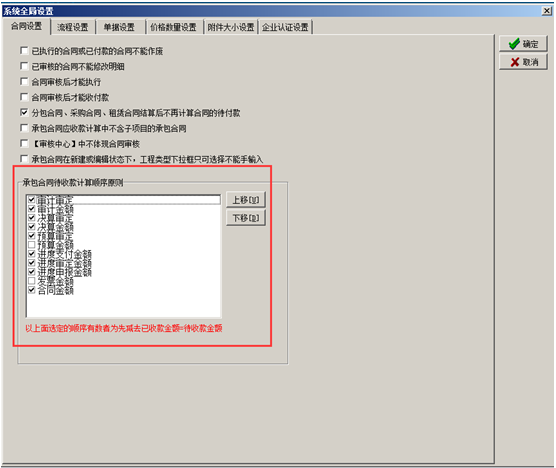 當(dāng)前合同應(yīng)收款在“全局設(shè)置”-“承包合同代收款計(jì)算原則”確定,進(jìn)入系統(tǒng)的“系統(tǒng)維護(hù)”-“系統(tǒng)全局設(shè)置”-“合同設(shè)置”-“承包合同代收款計(jì)算順序原則”(從上到下以打鉤且不為零為準(zhǔn)),如圖: