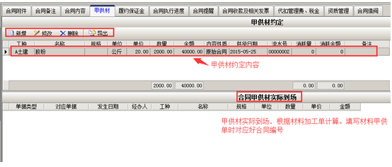 “甲供材料扣除工程款”是指當(dāng)甲乙雙方確定:某些材料(如大材)由甲方供應(yīng)、工程款中包括了甲方供給乙方的材料總金額。結(jié)算時(shí)甲方再扣除供給乙方總材料款。當(dāng)施工企業(yè)和甲方簽定的合同中有這個(gè)條款時(shí),一般都會(huì)確定兩個(gè)明細(xì)項(xiàng):1、需要甲方供應(yīng)XX材料、及材料結(jié)算單價(jià),2、合同款中包括甲供材金額(甲供材金額=結(jié)算單價(jià)*到場(chǎng)數(shù)量)。如果用戶簽訂的合同屬于該情況則在復(fù)選框內(nèi)打鉤。如果甲乙雙方約定“甲供材驗(yàn)收總額受控制”則當(dāng)累計(jì)甲供單金額超過(guò)約定金額時(shí)將不允許保存,需在復(fù)選框內(nèi)打鉤。在合同下方點(diǎn)擊“甲供材”,點(diǎn)擊“新增”的按鈕添加甲供材料的具體內(nèi)容,加工材料到場(chǎng)之后添加“材料甲供單”(注意對(duì)應(yīng)好合同編號(hào))會(huì)體現(xiàn)在甲供材到場(chǎng)內(nèi)容中,如圖: