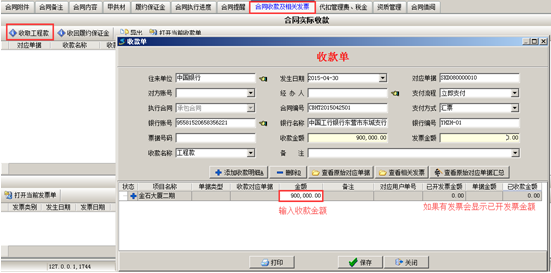 合同收款時(shí)點(diǎn)擊“合同收款及相關(guān)發(fā)票”,點(diǎn)擊“收取工程款”彈出收款單,填寫(xiě)收款單詳細(xì)信息,輸入收款金額,如果有開(kāi)發(fā)票需在“發(fā)票管理”添加發(fā)票信息并對(duì)應(yīng)好合同號(hào):