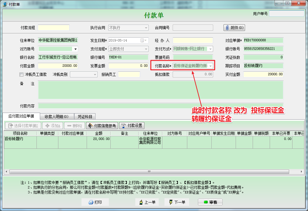 選擇結(jié)轉(zhuǎn)后,我們?cè)偃ゲ榭丛稑?biāo)保證金的付款單時(shí),發(fā)現(xiàn)付款名稱(chēng)變?yōu)椋和稑?biāo)保證金轉(zhuǎn)履約保證金,如下圖所示,
