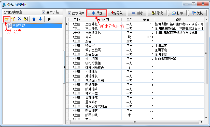 在做工程項(xiàng)目分包管理之前要做好往來單位維護(hù),人工工種維護(hù),分包內(nèi)容維護(hù),罰款分類維護(hù),分包預(yù)算單維護(hù)。