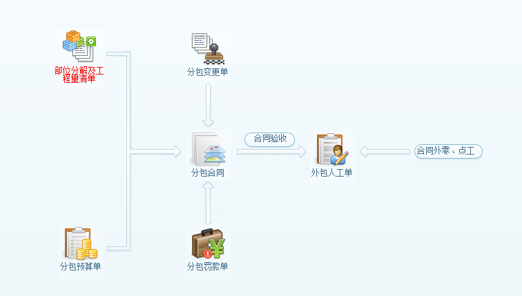 工程項(xiàng)目分包管理,可用于統(tǒng)計(jì)專業(yè)分包產(chǎn)生的成本及臨時(shí)雇用的零工成本。如軟件流程圖所示:分包成本是由外包人工單產(chǎn)成,其來源可分為兩部分,第一:來自分包合同中的合同驗(yàn)收,第二:來自合同外零、點(diǎn)工驗(yàn)收。