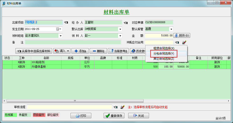 選定對應(yīng)合同后,點擊保存,這樣就可以實現(xiàn)分包工程款的沖抵。
