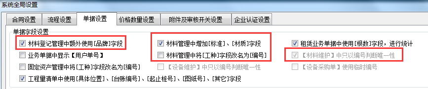 1、單據字段,比如開啟品牌,標準和材質的字段,工種字段改為編號,還有編號為材料的判斷標準。