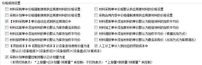 4、價格規(guī)則設置,里面包括材料計劃單、材料采購單及采購合同中材料價格幾種選擇方式,如強制使用原材料價格和默認使用原材料的價格。材料采購單單價自動生成到供應商詢價中,材料出庫單中添加材料的單價默認為庫存最后采購價,材料退庫單中添加材料的單價默認為班組領料的加權平均價,材料調撥單中添加材料的單價默認為加權平均價(根據出場方式)等開關。特別的,采購計劃單中,若以“上報量+已計劃量<預算量”來控制,需要開啟此開關。