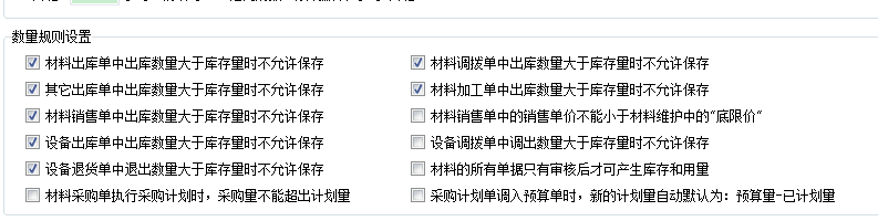 5、數量規(guī)則設置,在此開關中主要涉及,出庫數量大于庫存時是否允許保存。比如材料出庫單中出庫數量大于庫存時不允許保存。關于計劃單的開關,如材料采購單執(zhí)行采購計劃時,采購量不能超過計劃量,采購計劃單調入預算是,新的計劃量自動默認為:預算量-已計劃量。