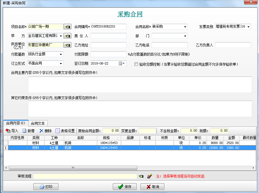 第一步,進(jìn)入工程項(xiàng)目管理系統(tǒng)的【材料管理】模塊,點(diǎn)擊[采購合同],如圖: