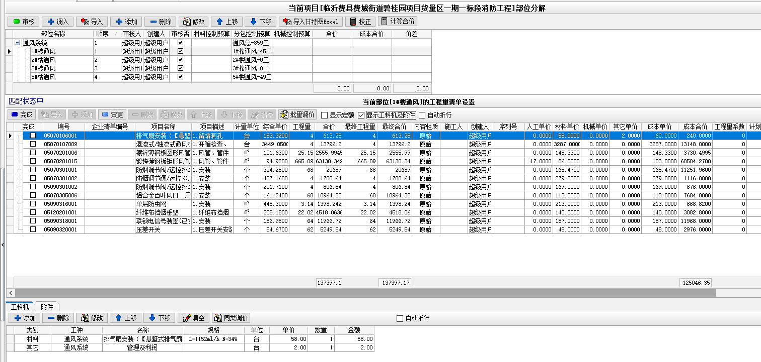 工程管理模塊下,【部位分解及工程量清單】中,部位部位分解中增加‘合價(jià)’、‘成本合價(jià)’和‘價(jià)差’三個(gè)字段,旨在體現(xiàn)出當(dāng)前部位下合同清單金額、成本清單金額(由企業(yè)清單中工料機(jī)計(jì)算得出)和兩者的差值形成的價(jià)差(實(shí)際就是利潤)。如下圖所示