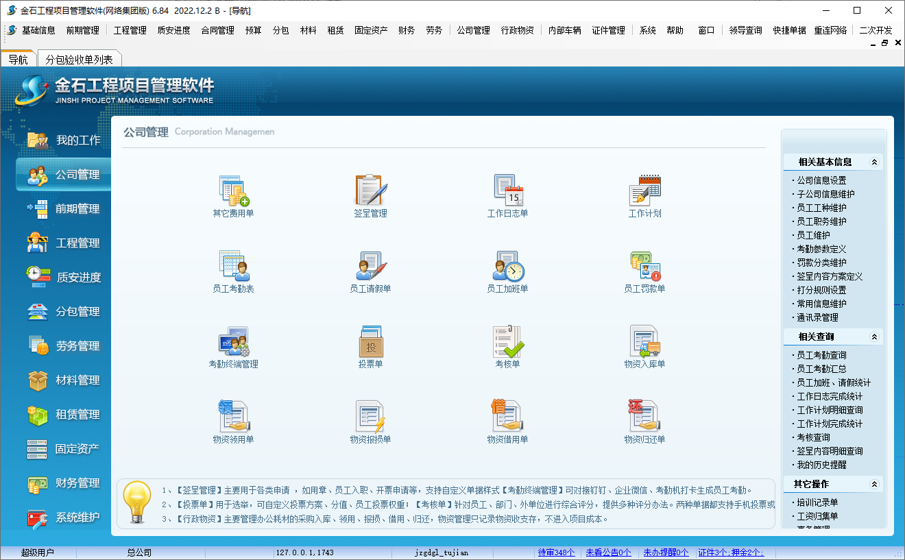 增加了公司管理,前期管理和勞務(wù)管理的導(dǎo)航模塊。公司管理模塊包括行政部門主要的管理內(nèi)容,如員工維護(hù)、員工考勤單、員工請假單、員工加班單、員工罰款單等員工管理的內(nèi)容;如物資入庫單、物資領(lǐng)用單、物資借用單、物資歸還單等行政物資的內(nèi)容;還增加了投票單和考核單的內(nèi)容。前期管理模塊主要包括項(xiàng)目收集單、項(xiàng)目開拓、投標(biāo)資料庫、報(bào)價(jià)資料庫和投標(biāo)人員業(yè)績查詢等內(nèi)容。勞務(wù)管理模塊主要是把原菜單的內(nèi)容添加進(jìn)來,讓導(dǎo)航模塊內(nèi)容更充實(shí)。