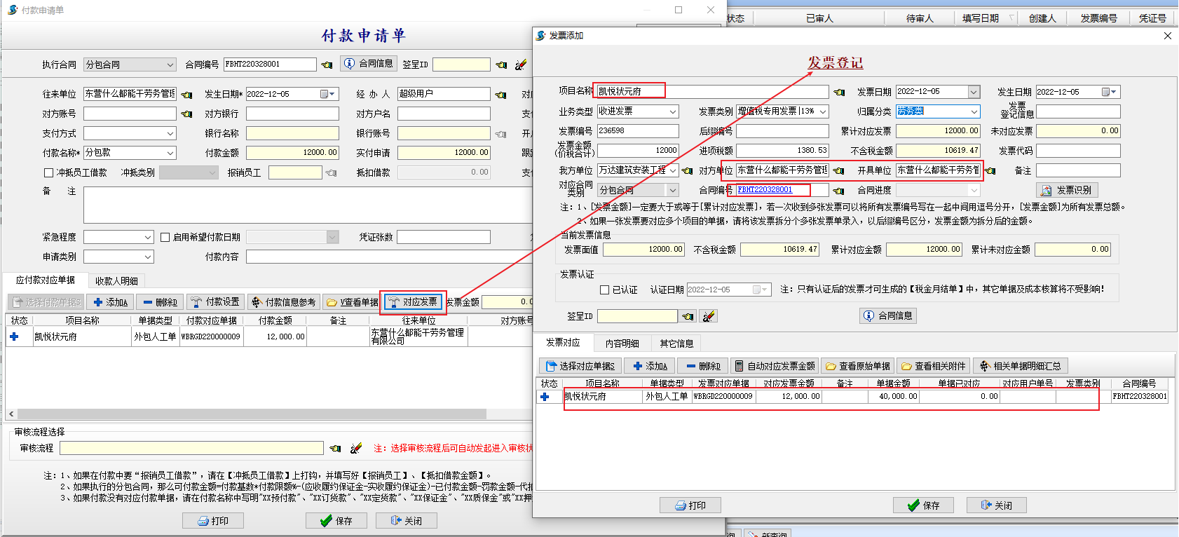 付款申請單界面可以直接做發(fā)票登記,做付款申請時(shí),可以打開發(fā)票登記界面即可錄入發(fā)票信息,省去了在付款申請?zhí)峤磺埃茸霭l(fā)票登記的步驟,點(diǎn)擊對(duì)應(yīng)發(fā)票,可以帶入項(xiàng)目名稱、對(duì)方單位、開具單位和合同編號(hào)等字段,下方明細(xì)表可以從付款申請單帶入對(duì)應(yīng)的單據(jù)信息,如下圖所示: