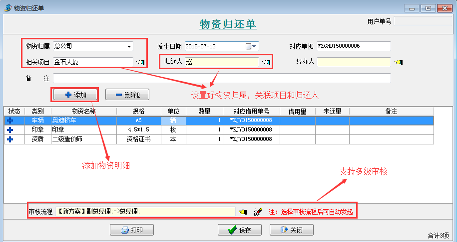 物資歸還單】是用來統(tǒng)計借用人歸還物資的業(yè)務(wù)單據(jù)。