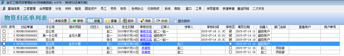 點擊主菜單中的【行政物資】->【物資歸還單】打開物資歸還單列表 點【新建】按鈕,錄入如下: