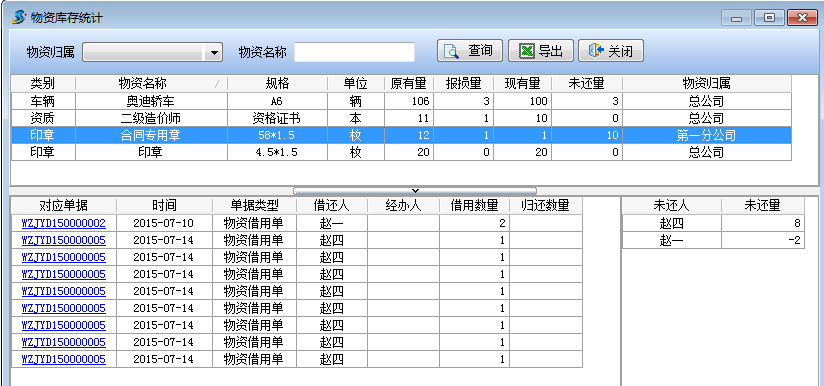物資庫存統(tǒng)計可以很方便查詢物資的借還記錄,物資借還人以及物資的未還量。當物資借用人想借用物資時,可以先查看物資庫存統(tǒng)計,方便借用物資。