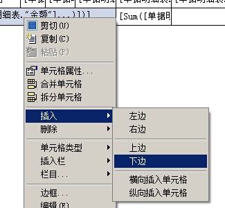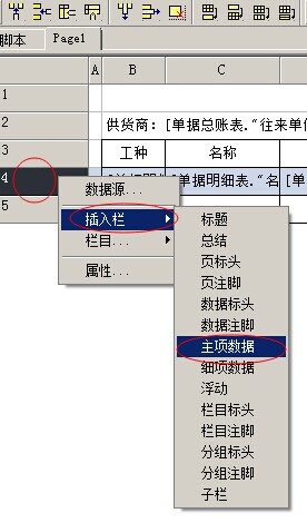 我們首先在左側(cè)第4行點擊鼠標右鍵,選擇插入欄(第一次使用,欄目中沒有,要選擇插入。第二次使用,在欄目中選擇),選擇【主項數(shù)據(jù)】。在彈出的窗口中選擇【單據(jù)明細表】。如下面兩張圖:
