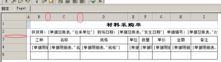 7. 把單據(jù)中需要打印的內(nèi)容,放入表格中。例如:材料的工種,名稱、規(guī)格、單位、數(shù)量、單價、金額、備注等,如下圖,在第三行中我們輸入名稱,第三行中輸入對應的字段名稱。