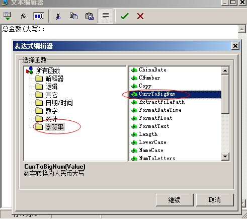 再來插入一個大寫,累計金額。同樣是選擇插入函數(shù),選擇字符串中的,CurrtoBigNum, 點繼續(xù)按鈕,然后把之前得出的結(jié)果[Sum([單據(jù)明細表."金額"],,,)]復制到里面。
