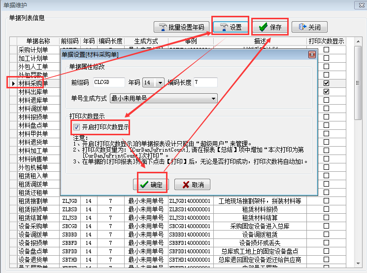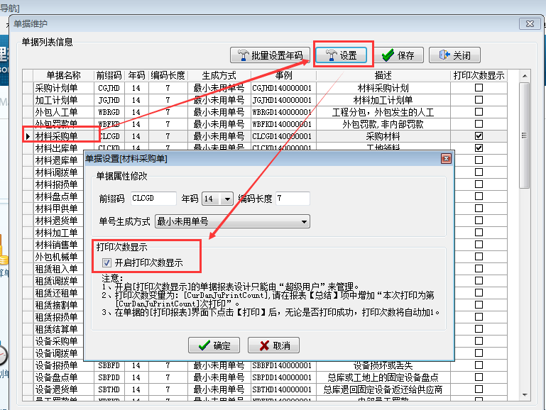 登錄超級(jí)用戶,在菜單欄【系統(tǒng)】-【單據(jù)維護(hù)】找到對應(yīng)業(yè)務(wù)單據(jù),點(diǎn)擊設(shè)置按鈕在開啟打印次數(shù)顯示處打上對勾,然后點(diǎn)擊確定。如下圖: