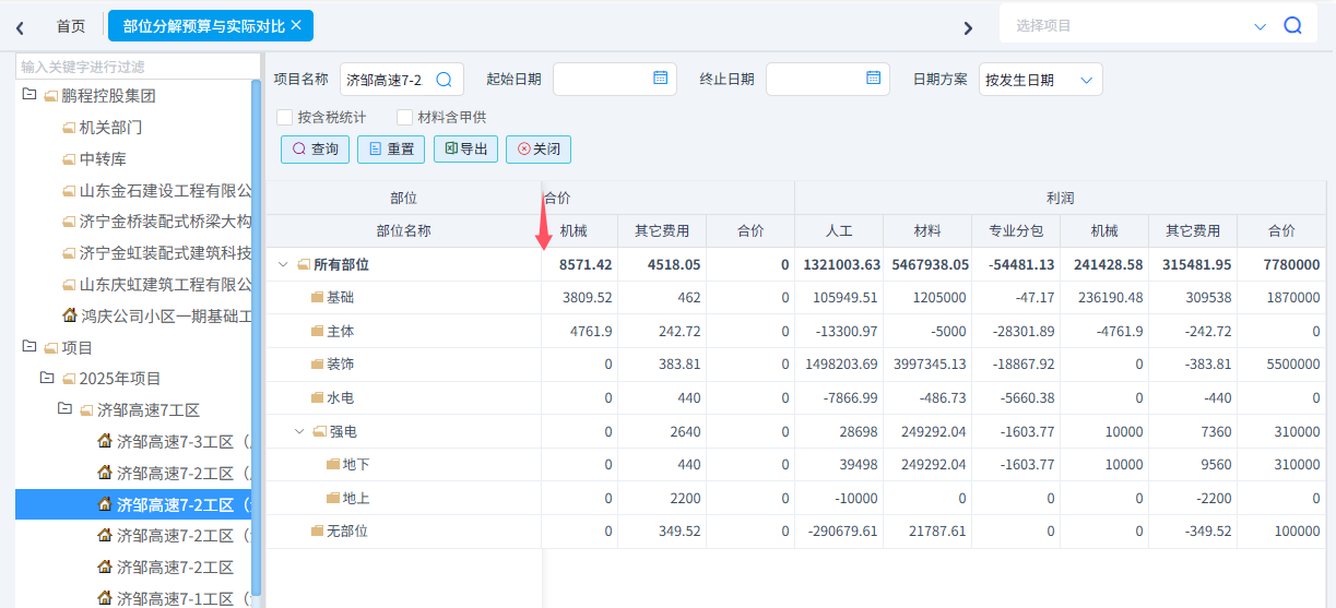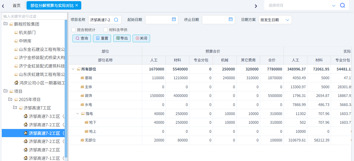 可以統(tǒng)計工料機(jī)預(yù)算與實際對比、合同清單與實際發(fā)生對比、分部分項四算對比