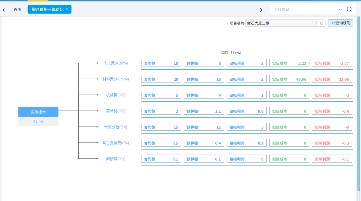 根據(jù)設(shè)置的合同人工費、合同材料費、合同機(jī)械費、合同周轉(zhuǎn)材、合同專業(yè)分包、合同其他直接費、合同間接費、合同金額、預(yù)算人工費、預(yù)算材料費、預(yù)算機(jī)械費、預(yù)算周轉(zhuǎn)材、預(yù)算專業(yè)分包、預(yù)算其他直接費、預(yù)算間接費、預(yù)算金額16項預(yù)算金額與實際發(fā)生金額進(jìn)行對比,實際發(fā)生金額計算規(guī)則可以根據(jù)查詢規(guī)則進(jìn)行設(shè)置。