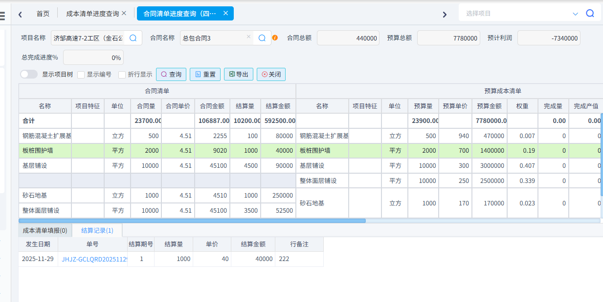 可以根據(jù)需求統(tǒng)計成本清單進(jìn)度、合同清單進(jìn)度(四算對比)、項目部位實際發(fā)生以及部位分解預(yù)算與實際發(fā)生。