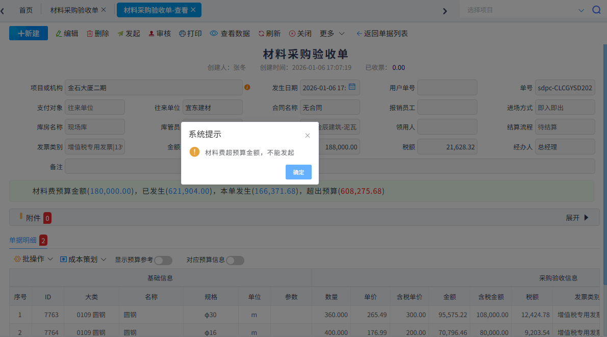 可按照人工費、材料、專業(yè)分包、周轉(zhuǎn)材租賃、機(jī)械租賃、其它費用填寫明細(xì)預(yù)算。成本業(yè)務(wù)單據(jù)發(fā)生業(yè)務(wù)超出預(yù)算后進(jìn)行預(yù)警控制