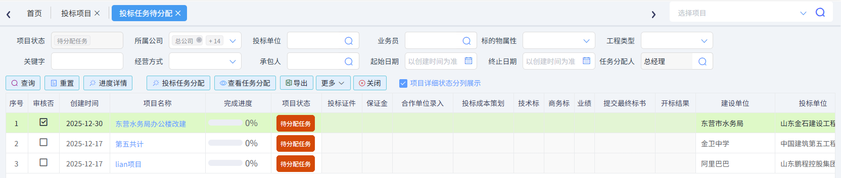 點擊查詢,會列出當(dāng)前任務(wù)分配人待分配的項目,選中后,點擊投標(biāo)任務(wù)分配,會彈出分配任務(wù)界面,如下圖所示