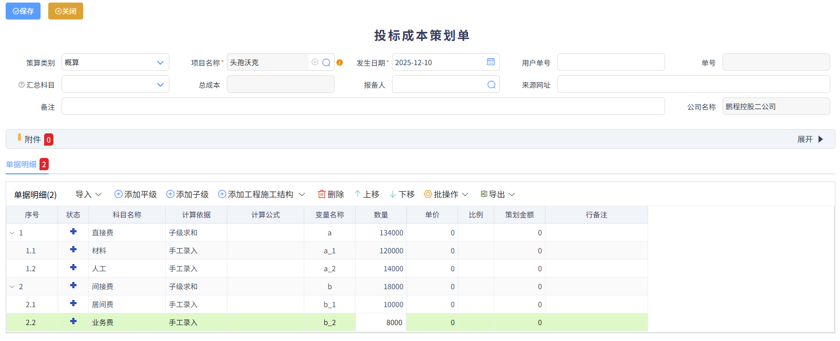 投標(biāo)策劃分估算和概算兩種。估算沒有可關(guān)聯(lián)的項目名稱,即沒有確切的項目名稱,需要手動輸入;概算是可以關(guān)聯(lián)投標(biāo)階段的項目名稱的。如下圖所示