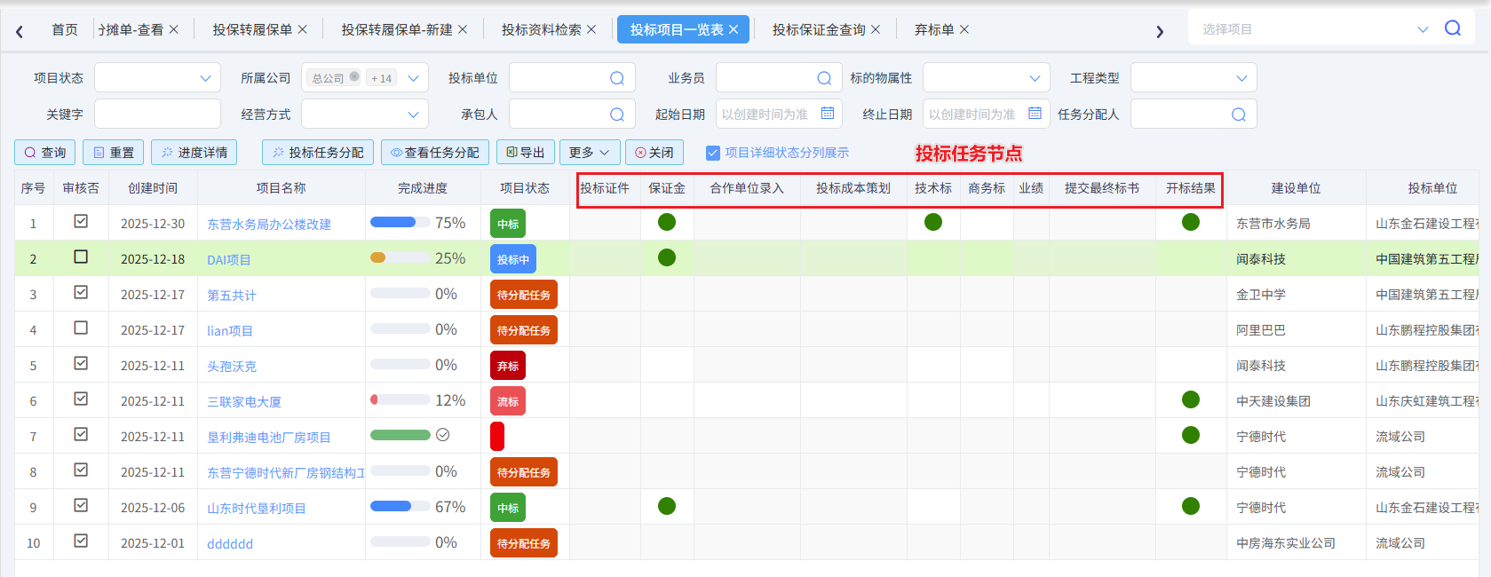 投標(biāo)項目一覽表可以查看投標(biāo)項目狀態(tài)、完成度、投標(biāo)任務(wù)節(jié)點、中標(biāo)單位、中標(biāo)金額等信息,如下圖所示