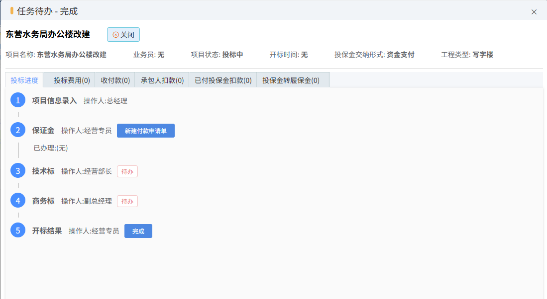 付款申請審核通過后,由財務(wù)出納做付款單,完成投保金付款的閉環(huán)。在投標(biāo)任務(wù)已辦中,可看到狀態(tài)的變化。如下圖所示