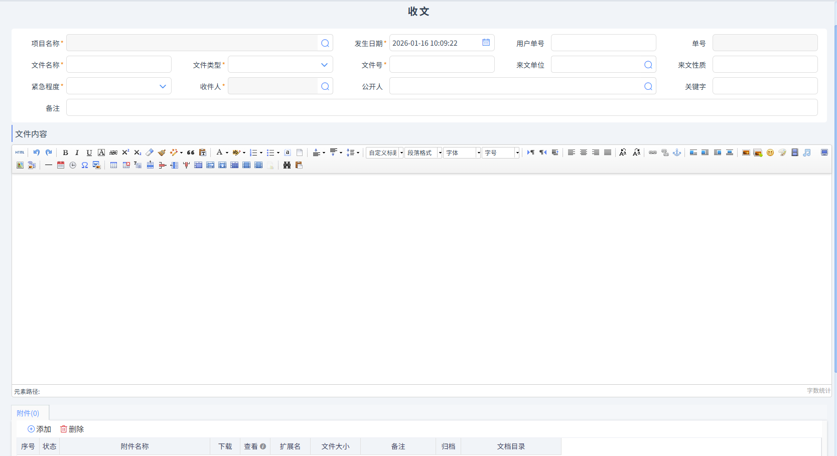 來(lái)文后,根據(jù)來(lái)文信息,填入收文中,項(xiàng)目名稱、文件名稱、文件類型、來(lái)文單位、來(lái)文性質(zhì)、收件人、公開(kāi)人等,特別注意的是下方要附上來(lái)文的原始文件電子檔,如下圖所示