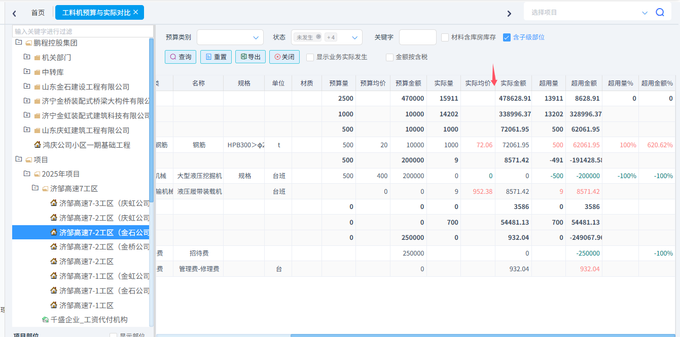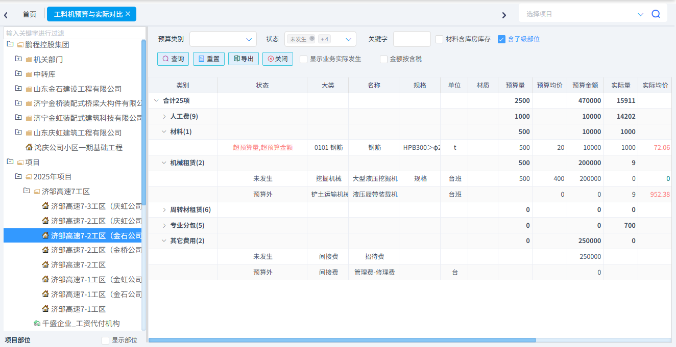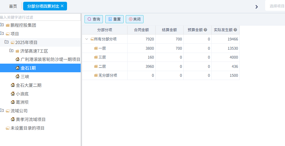 可以統(tǒng)計(jì)工料機(jī)預(yù)算與實(shí)際對(duì)比、合同清單與實(shí)際發(fā)生對(duì)比、分部分項(xiàng)四算對(duì)比