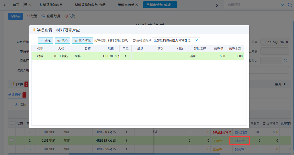 如果單據(jù)填寫時(shí)或者以后查詢預(yù)算對(duì)比時(shí)發(fā)現(xiàn)預(yù)算材料跟實(shí)際發(fā)生不一致,可以選擇手動(dòng)對(duì)應(yīng)預(yù)算