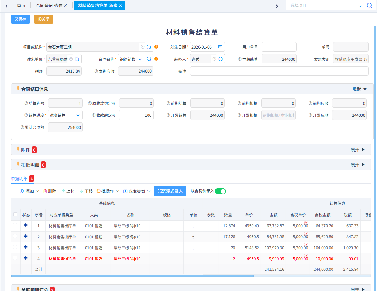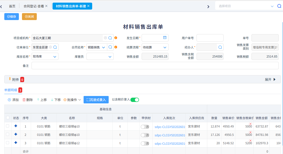 針對(duì)系統(tǒng)集成、市政路橋等行業(yè)有銷售業(yè)務(wù)可以填寫銷售合同,根據(jù)銷售合同生成材料銷售出庫(kù)單、材料銷售結(jié)算單。