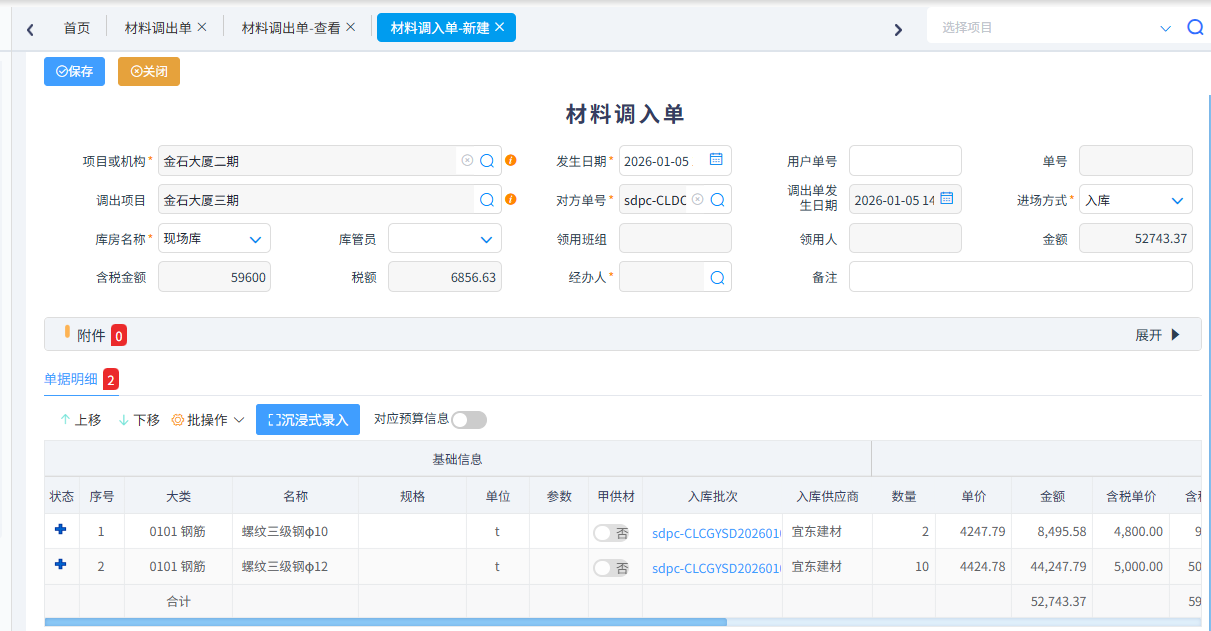 項(xiàng)目與項(xiàng)目或者公司總庫與項(xiàng)目之間調(diào)撥材料時(shí)由調(diào)出方填寫材料調(diào)出單,收入方填寫材料調(diào)入單,其中調(diào)入單必須根據(jù)材料調(diào)出單生成,調(diào)出單含稅金額會(huì)產(chǎn)生雙方的應(yīng)收應(yīng)付,后期可使用內(nèi)部資金劃轉(zhuǎn)單進(jìn)行資金支付。 材料調(diào)出單中發(fā)票類別選了帶稅率的類型,稅金也能調(diào)撥,為后續(xù)項(xiàng)目稅金月結(jié)單使用。