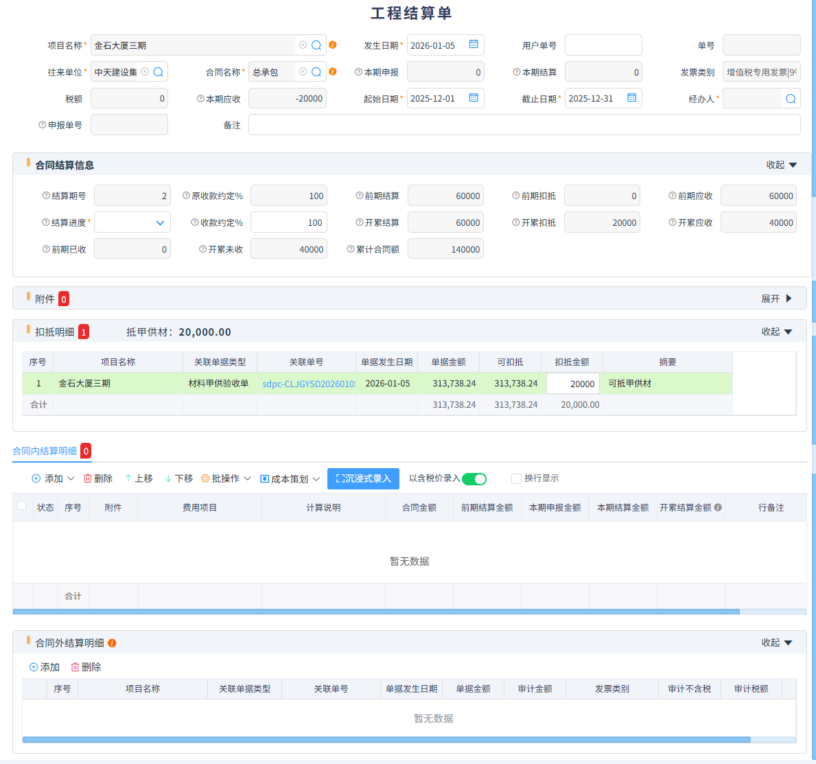 在與甲方結(jié)算時會自動扣除甲供材,扣抵金額可以自行輸入,分多次扣抵。